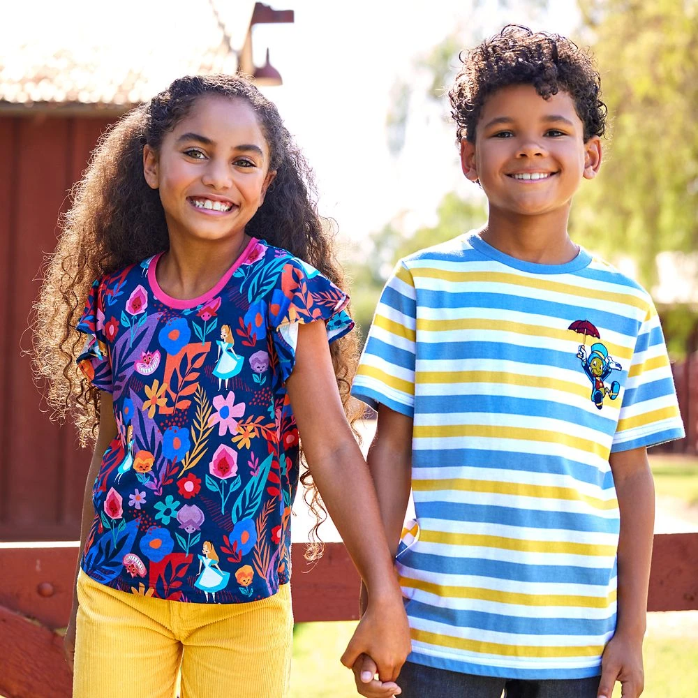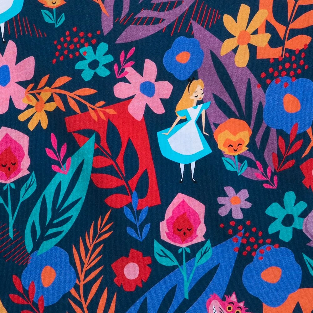 Where is the land beyond the eye that people cannot see? Where can it be? In Wonderland, of course, home of this wondrous fashion tee. Alice, the Cheshire Cat and the garden of live flowers are colorfully stylized allover this surreal top with scalloped edge sleeves and contrast neckline.